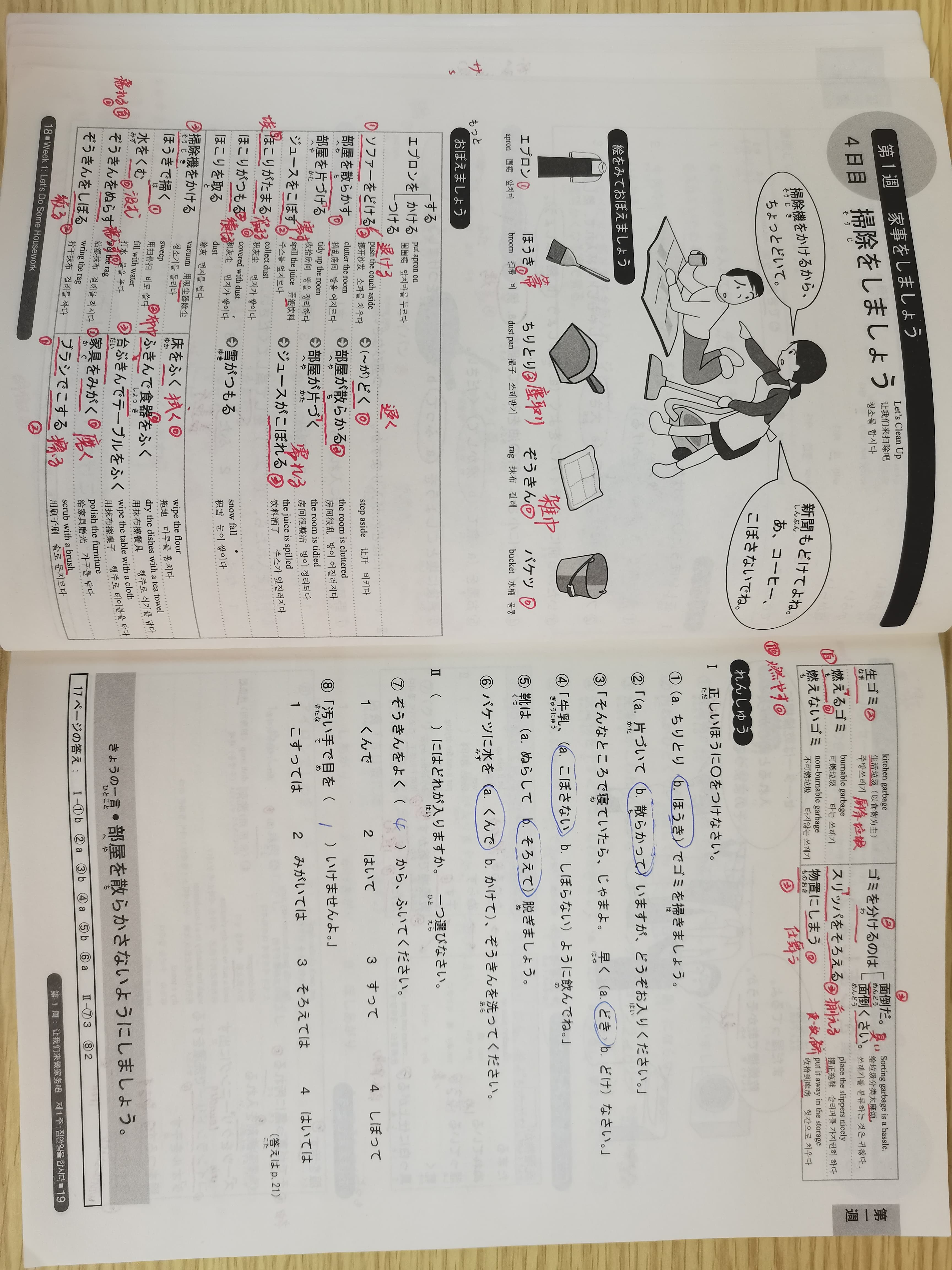 | エプロン・箒(ほうき)・塵取り・雑巾・バケツ | 围裙;扫帚;撮子,簸箕;抹布;水桶 |