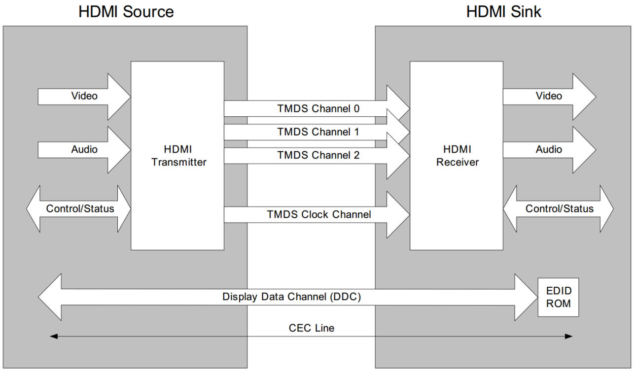 类似TMDS的连接图,上图HDMI模块也是四个TMDS的通道。DDC是传输一些标识数据的(如分辨率等),CEC是用于电气控制的,不用管。