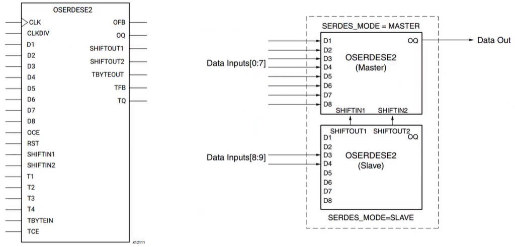 使用了SerDes原语,要传输10bit需要两个OSERDESE。其中master输入8bit;slave输入2bit,通过扩展位接到master上。