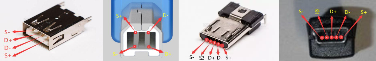 拓展一下USB接口的定义。下图从左到右分别是USB-A、USB-B、USB-micro、USB-mini。