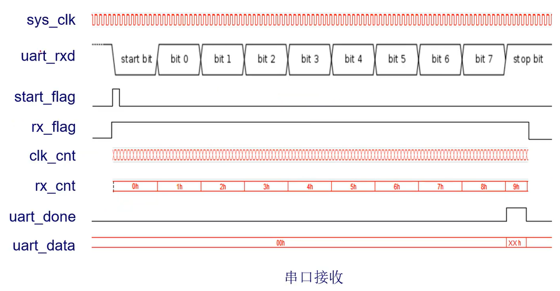 下图是接收的时序示意图(发送也是类似的,只不过rx变为tx),对其中的信号/变量作简单说明: