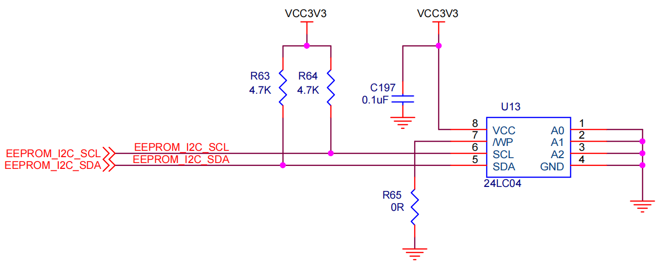 A0,A1,A2:定义该芯片的地址,最多支持8个芯片共用I2C总线,因为这里只有一个芯片,直接全部置0;SCL,SDA:I2C总线;WP:写保护,拉高则无法写,这里始终拉低。