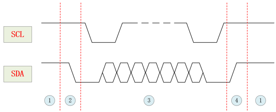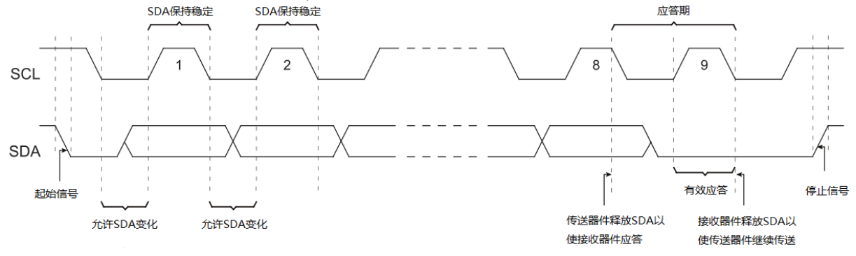 - SDA只能在SCL为低电平时改变,在SCL为高电平时必须保持稳定。
