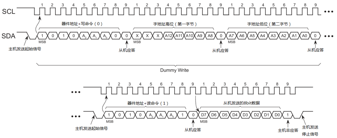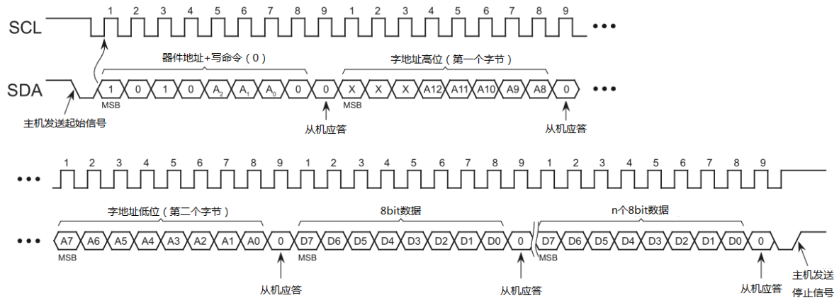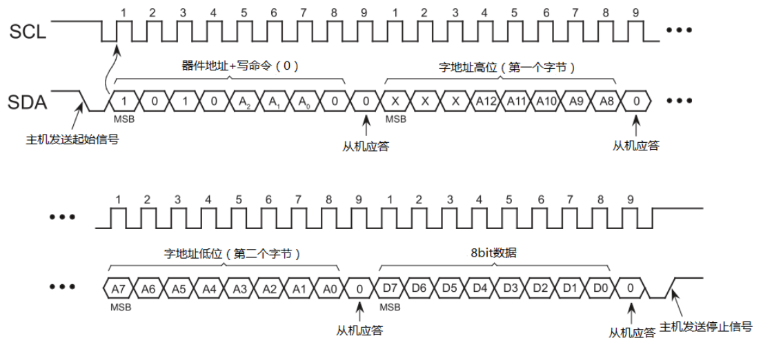 先发送器件地址,再发送存储地址,最后发送8bit数据。注意每字节的传输都有应答信号,最后主机要发送停止信号。