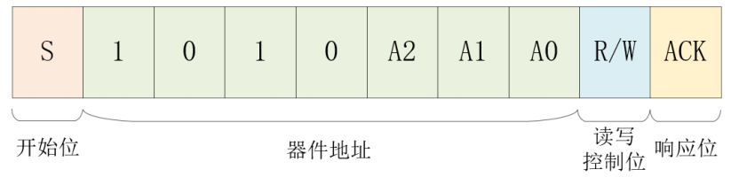 在传输数据时,第一个字节需要发送器件地址,即下图的绿色部分(7bit),前4位固定为1010,后3位为A0,A1,A2。第8位是读写控制位,表示该轮传输是读(1)还是写(0)。