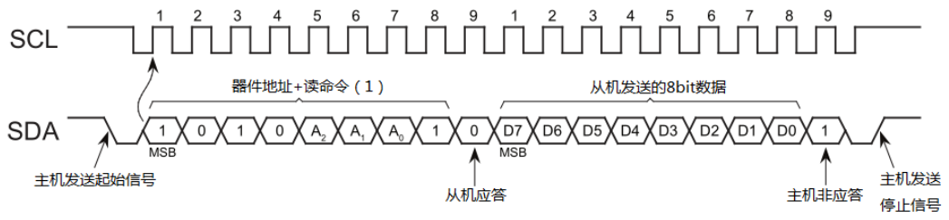 时序如上,接收完8bit数据后不应答(ACK拉高),发送停止信号。