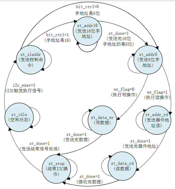 下图是I2C驱动中状态机的状态转换图。从左边的idle状态开始,大致流程为根据bit_ctrl决定发送几位字地址,然后根据wr_flag决定是执行读还是写操作。